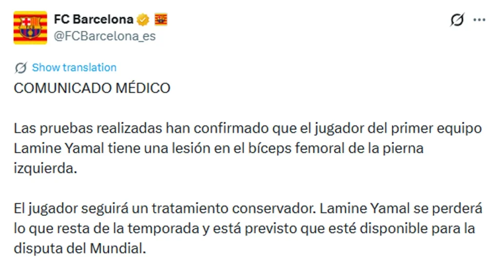 Sin embargo, el club blaugrana llevó tranquilidad para los hinchas ya que estaría en condiciones para disputar la cita mundialista en Estados Unidos, Canadá y México: «El jugador seguirá un tratamiento conservador. Lamine Yamal se perderá lo que resta de la temporada y está previsto que esté disponible para la disputa del Mundial».