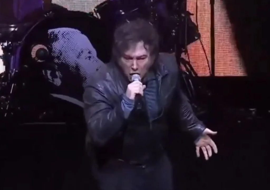 Para graficar el punto, el libertario utilizó un fragmento del mini recital que brindó con la Banda Presidencial en el Movistar Arena, y cantó la canción emblema de Nino Bravo aunque cometió un error.