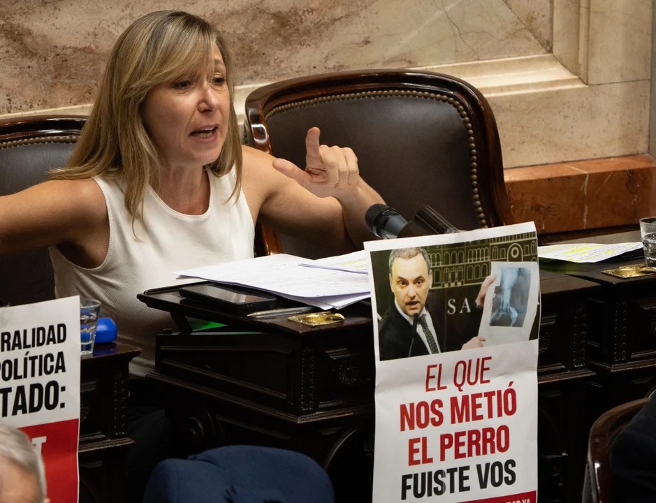 Por último, se refirió al cartel que ella misma cogló en su banca y que le pidieron en el Congreso que lo quite debido a que “se puede dañar en mármol”: “No sé si el de la pared o el de la cara de Adorni”, concluyó.