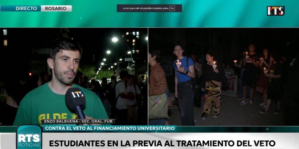 La Federación Universitaria de Rosario (FUR) llevó adelante una vigilia en la Facultad de Ciencias Médicas en rechazo al veto del presidente Javier Milei a la ley de financiamiento universitario. El secretario general de la organización, Enzo Balbuena, sostuvo que la medida afecta el funcionamiento básico de las casas de estudio.