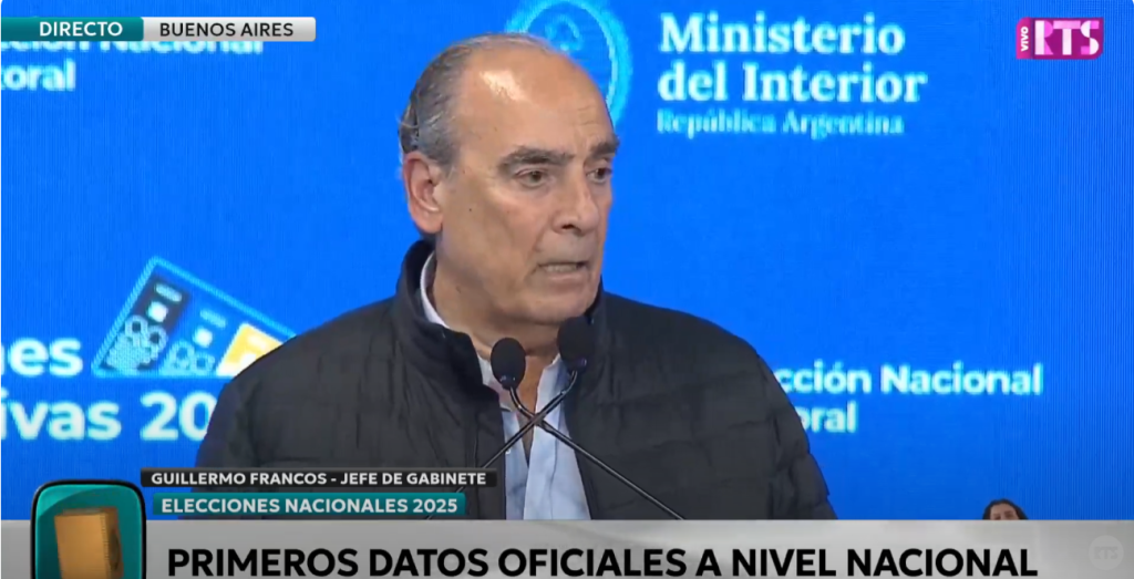 Guillermo Francos, jefe de Gabinete de la Nación, detalló los primeros resultados de las elecciones legislativas y destacó la implementación de la boleta única en papel. Según el escrutinio de hasta el 91,54% del padrón, La Libertad Avanza lidera con 8.650.710 votos, equivalentes al 40,84%, obteniendo 64 bancas de diputados nacionales.