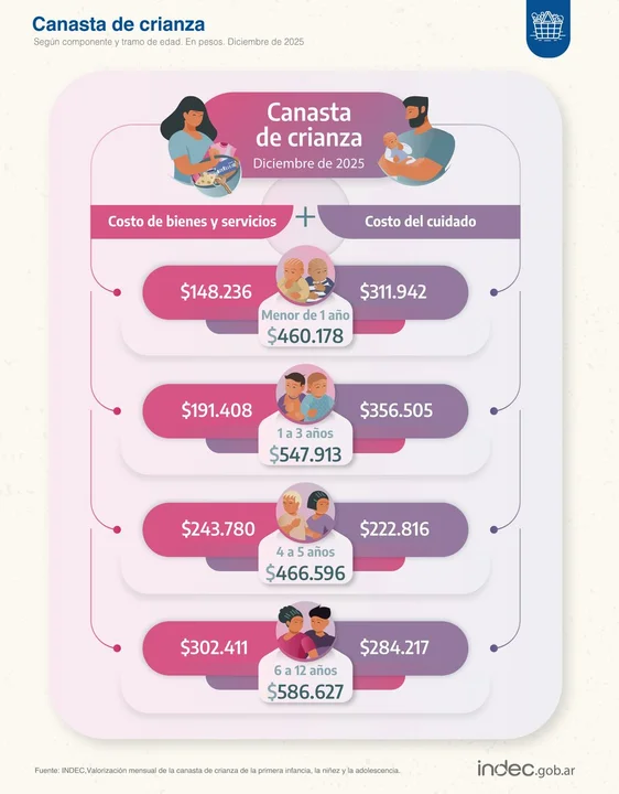 El INDEC precisó que el componente de bienes y servicios se calcula a partir de la Canasta Básica Total (CBT) del Gran Buenos Aires, que incluye alimentos, vestimenta, transporte, educación, salud y vivienda, entre otros rubros. En tanto, el costo del cuidado surge de la valorización de las horas teóricas necesarias para la atención de los niños, tomando como referencia la remuneración del personal de casas particulares.