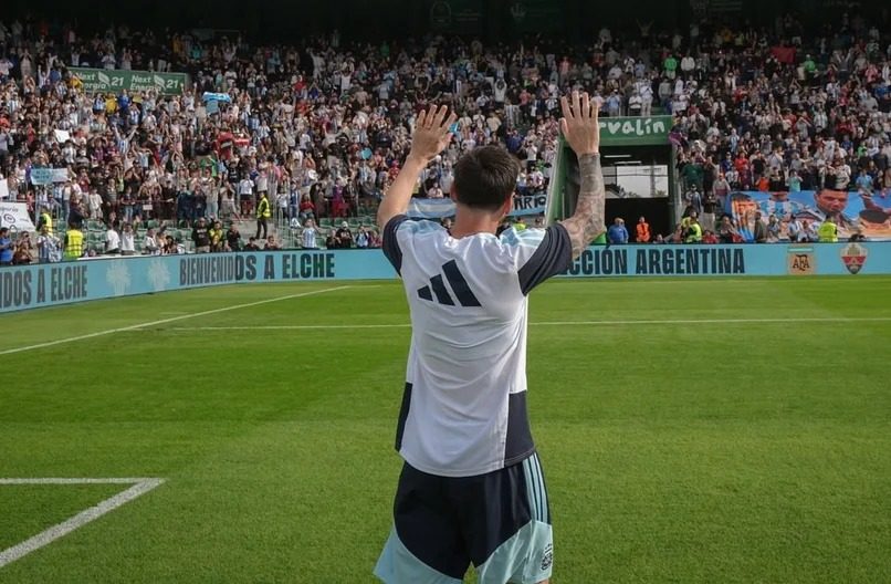 Messi, que disputará este viernes el partido entre la Selección argentina y Angola, publicó varias imágenes del entrenamiento en el estadio Manuel Martínez Valero de Elche, en el que miles de fanáticos se acercaron para alentar antes del viaje de los dirigidos por Lionel Scaloni a África.