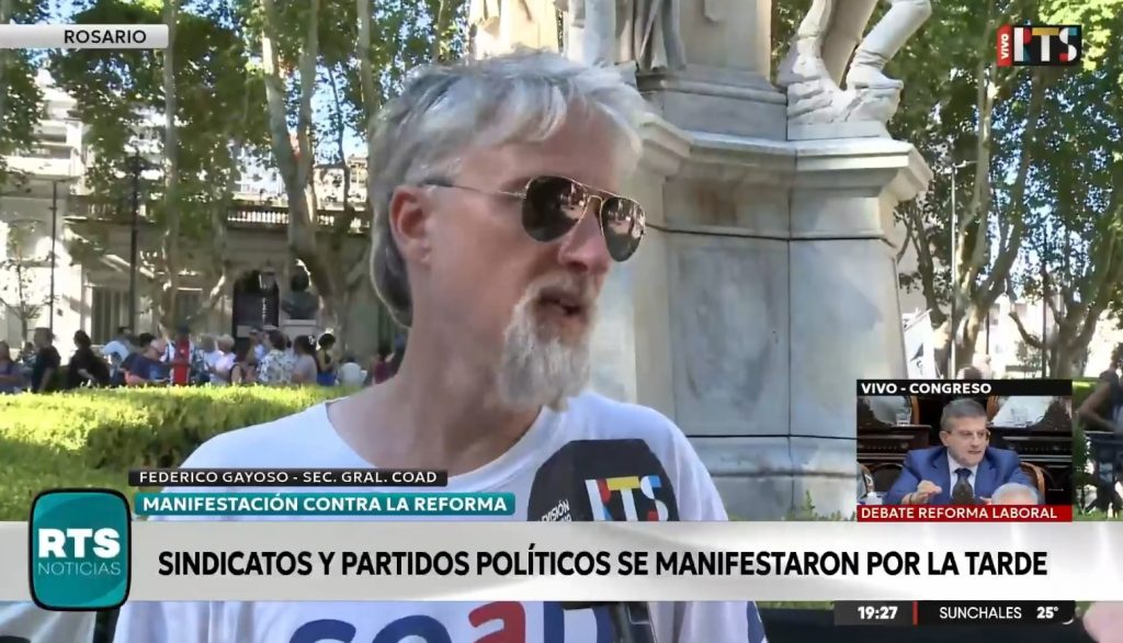Federico Gayoso, secretario general de COAD Rosario, sostuvo que “este gobierno de Milei vino a declararle la guerra a los trabajadores desde que asumió” y afirmó que la iniciativa busca “garantizarle a las grandes élites nacionales y extranjeras un margen de ganancia extraordinaria a costa de los trabajadores”.
