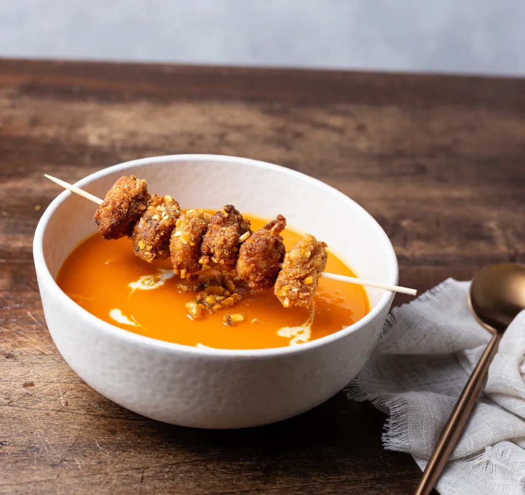 Elaboración: El pulpo ya está congelado en esta zona, así que estará tierno cuando lo se lo prepare. Se descongela y cocina en agua caliente con sal y unas hojas de laurel. Después se escurre y se reserva. Para hacer la crema de calabaza, se corta la calabaza y las dos papas en trozos y se cocina en el horno envueltos en papel aluminio. Luego se pela y reserva, mientras se prepara la base de cebolla con el hinojo. Para esto,se pica una cebolla y se la saltea en la sartén junto a un trozo de hinojo picado. Cuando esté todo bien dorado, se añade a la sartén los trozos de calabaza y papas cocidas, salteamos y trituramos añadiendo un poco de crema o manteca para llegar a la textura cremosa que nos guste. En el momento de servir, se reparte la crema de calabaza en compoteras. Salteamos en una sartén los trozos cortados de pulpo hechos brochettes y agregamos sal y pimentón picante o dulce (a gusto). Se sirven sobre las compoteras con crema de calabaza, o en platos individuales.